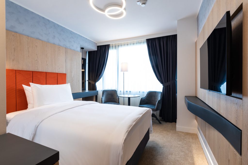 Destinată celor care călătoresc în doi sau preferă un plus de spațiu, camera Standard Queen oferă 25 mp de confort, un pat queen size generos și o atmosferă elegantă. Ideală pentru un city break sau pentru o ședere mai lungă, această cameră este dotată cu Wi-Fi gratuit, birou ergonomic, minibar, aer condiționat reglabil și baie modernă cu finisaje premium.